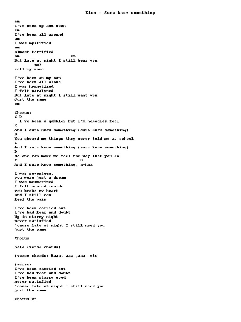 Acordes Kiss Sure Know Something - Play along with guitar, ukulele, or piano with interactive chords and these songs are hand picked to start your journey as a guitar, ukulele or piano player.